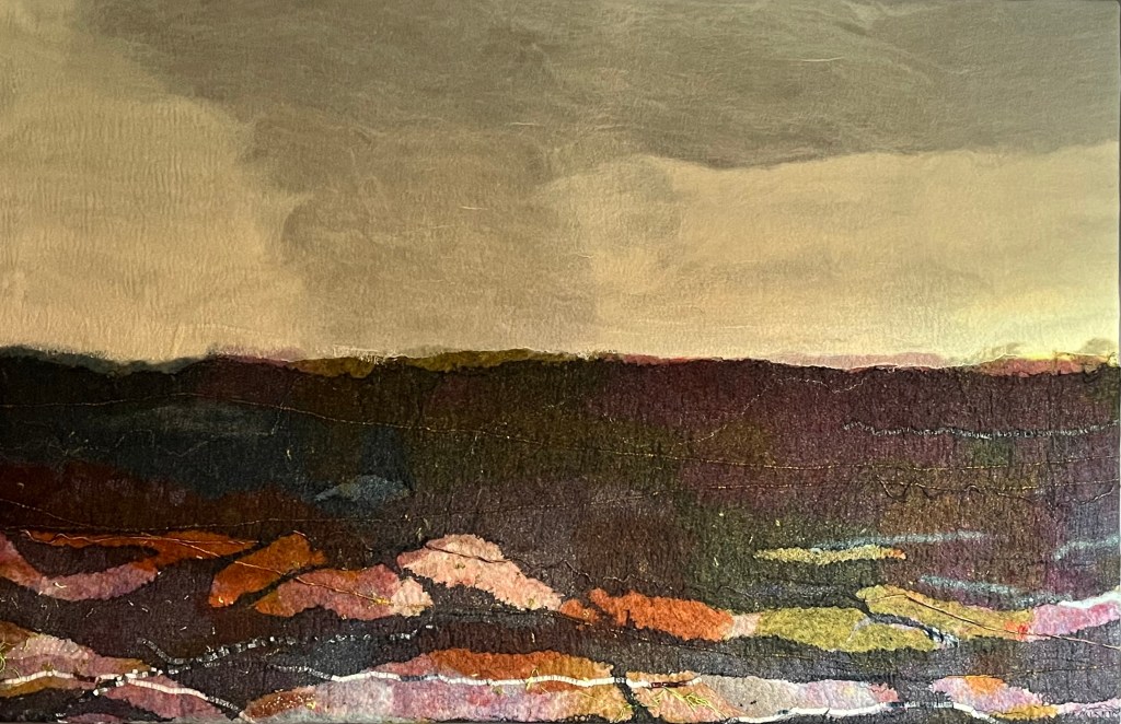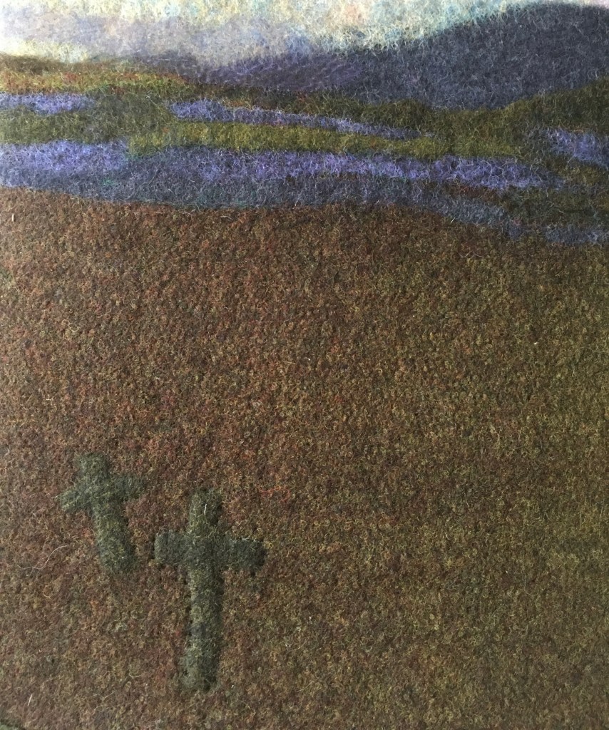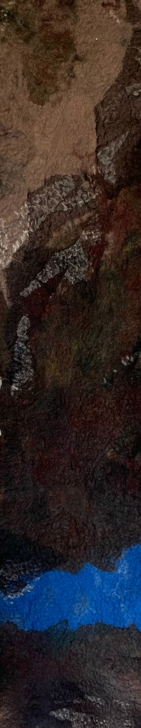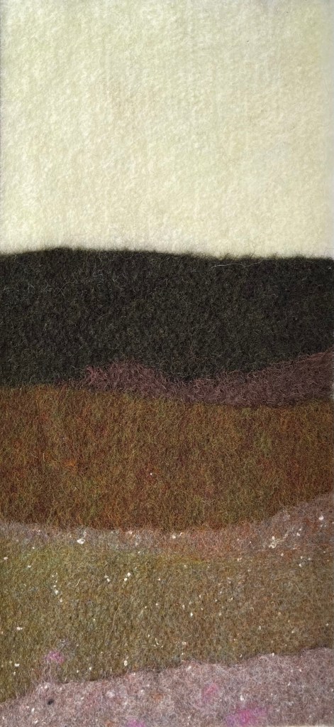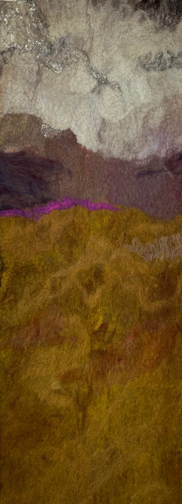 Iceland, Approaching Geysir [approx 32×158 cm – detail]. Icelandic sheep wool mixed with merino fibres and embedded fabrics. In winter the sun is very low and lights up the hillside around Geysir turning it into shades of ochre & brown topped with violet.