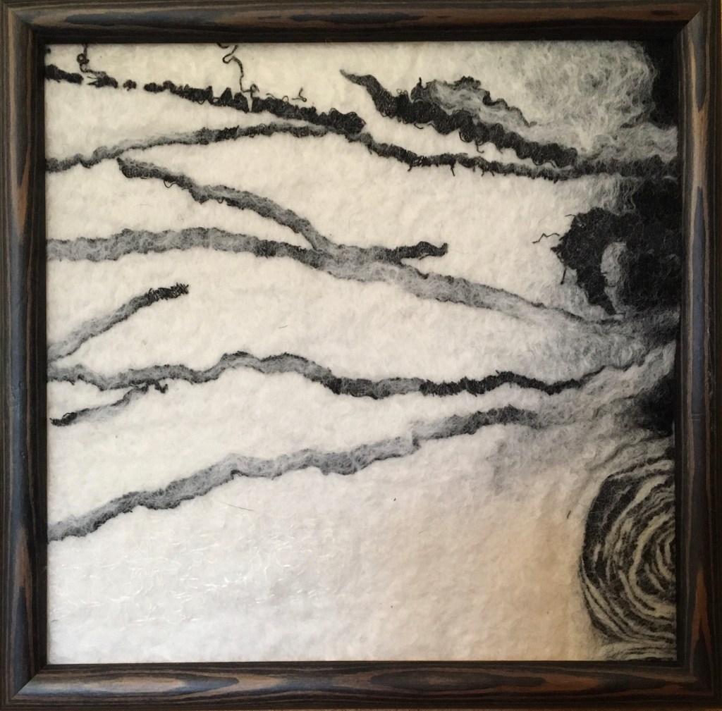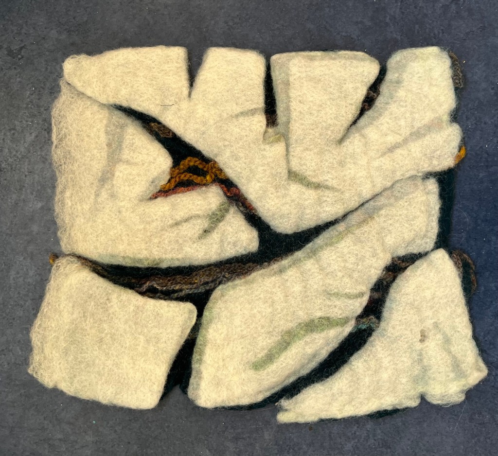 Felting transforms loose fibres into a material with a resilient but soft character. This medium can be used in sympathy with the subject, or provide tension with contrast to the subject. In my work I use wool fibre to capture other materials and through a process of constructing and deconstructing both two and three dimensional works are produced.