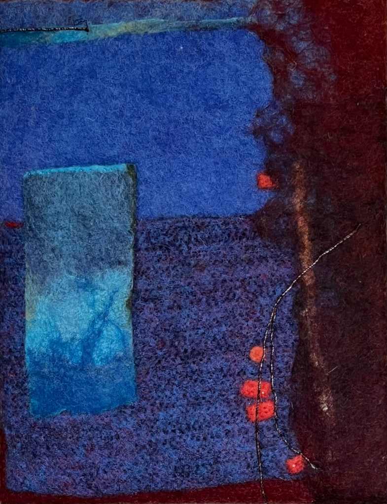 ‘Blue’ – abstract based on the colours of water, seaweed and floats at dusk. Wool fibre & thread.