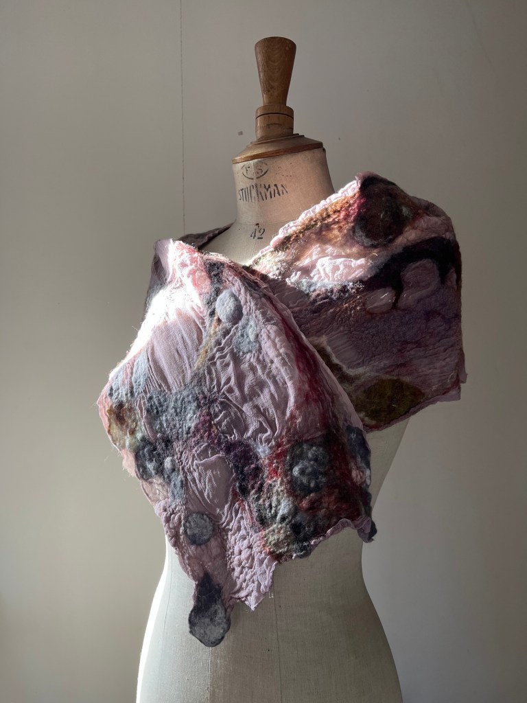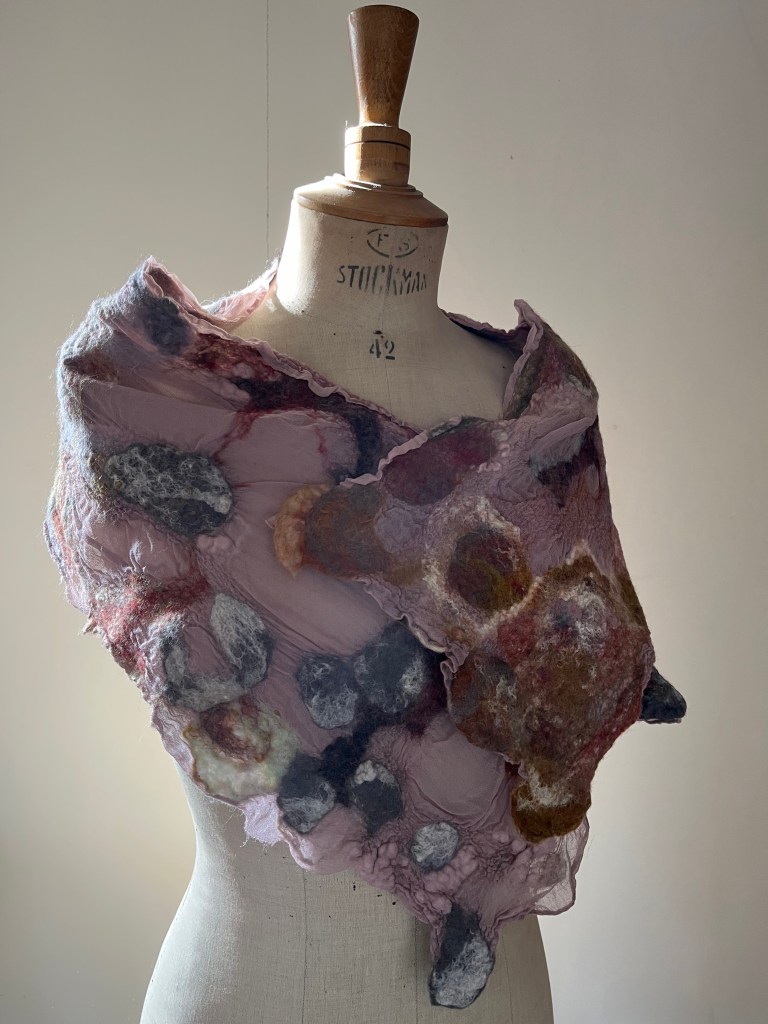 Wearable, or hanging, based on volcanic mud. Wool fibre on silk chiffon base creating Nuno felt fabric.