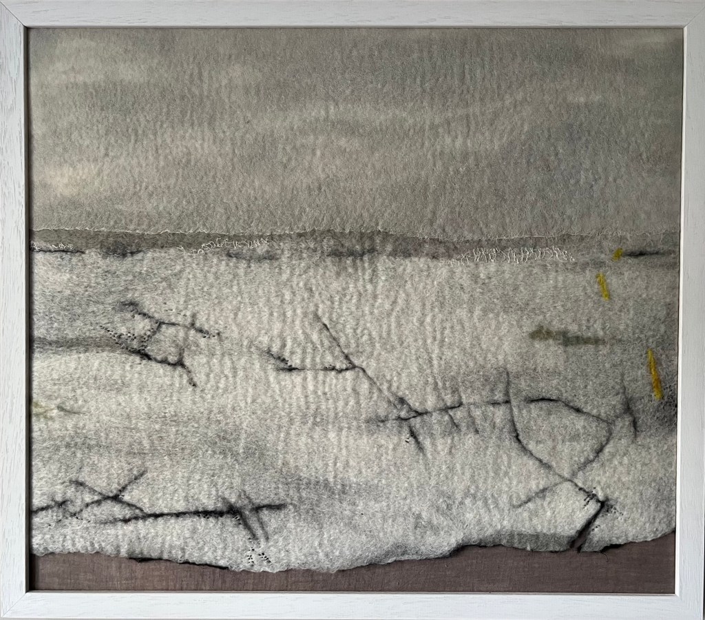 Glacier – merino fibre, part silk chiffon overlay, embedded fabric, stitch and cutwork. The piece is framed so that the lower edge ‘flows’ over a linen base. The touches of yellow reference the marker poles of the interior highlands.